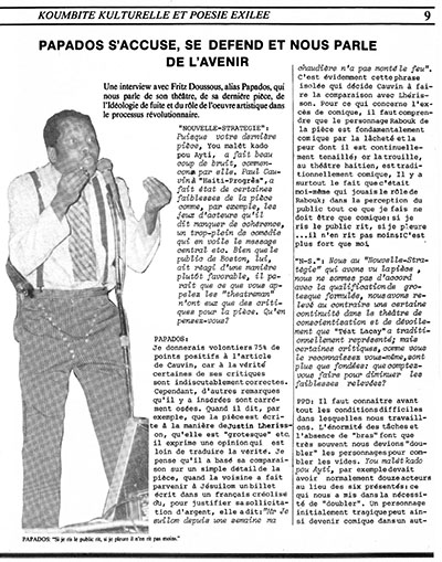 Fac-similé d’une interview de Papadòs avec l’ancienne revue littéraire Nouvelle Stratégie, 1985.