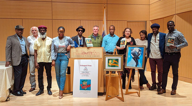 From left to right: Charlot Lucien, Joseph Bocchicchio, Doumafis Lafontant, Milady Auguste, Jean-Dany Joachim, Aidan Rooney, Mario Malivert, Jill Netchinsky, Danielle Legros Georges, Tontongi & Fred Edson Lafortune at the Cambridge Public Library on October 28, 2023, for the launch of the trilingual anthology This Land, My Beloved. —photo Tanbou, 2023